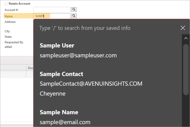 Locate existing customers by using the Account and Name search fields.