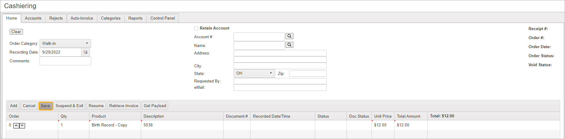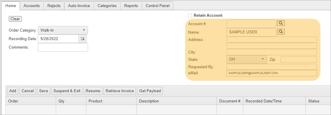 You do not need to enter any customer information or create a new account for non-recordable items. Walk-In order transactions are saved to “Account #0.”