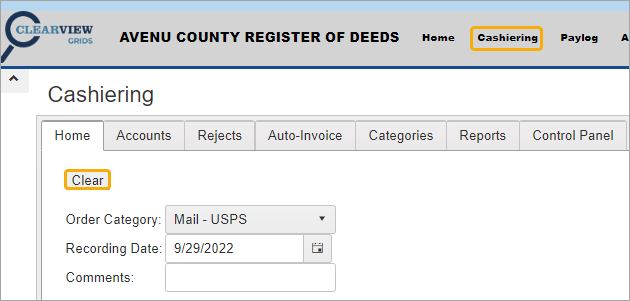 Navigate to the Cashiering Home tab.
