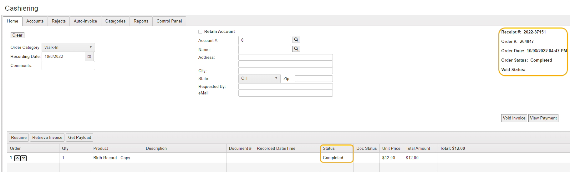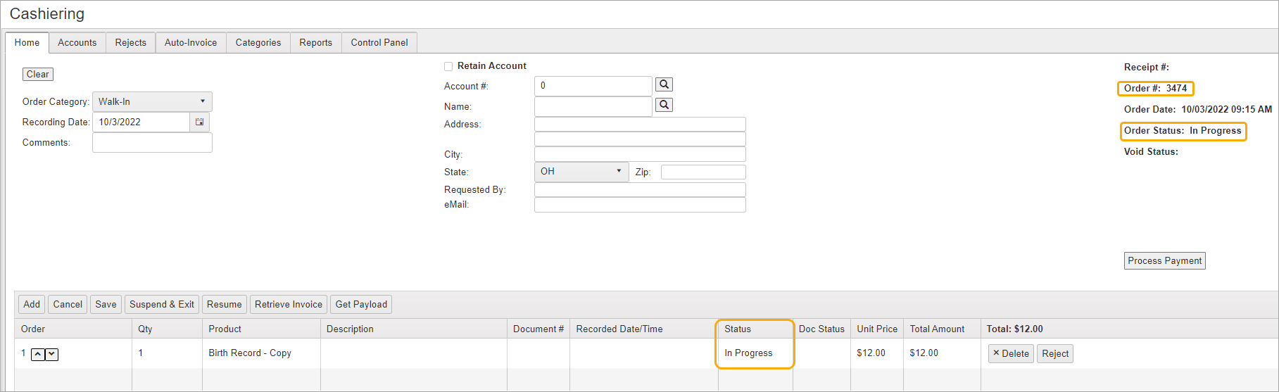When the order has been paid and the Print Options and Payment Pages are closed, you will be returned to the Cashiering screen which displays the updated information.
