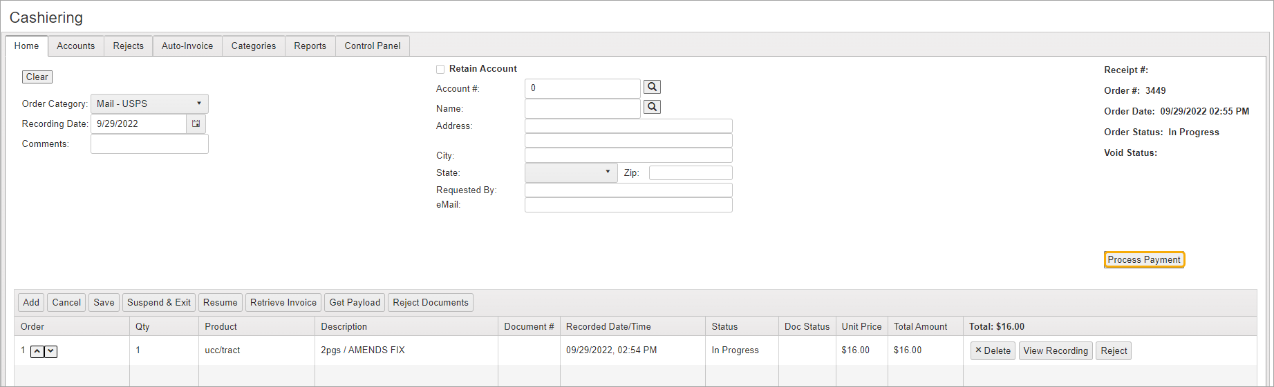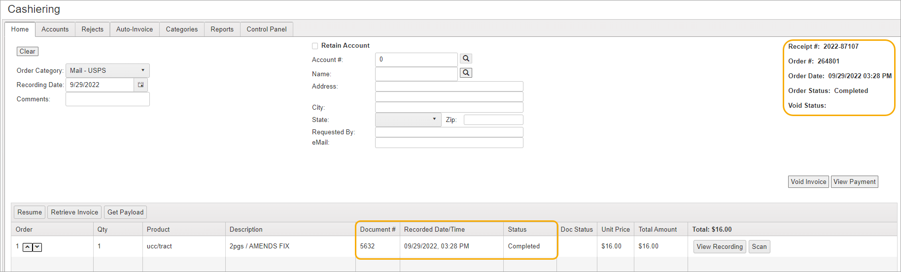 Next, the order is cashiered, receipts are printed, and required stamps applied. You can then scan the documents into the system or wait until after you’ve finished processing orders.