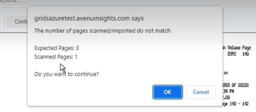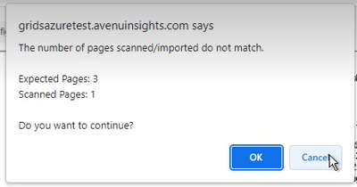 If the scanned page count doesn’t match the number of pages indicated in the recorded document information, an error message is displayed.