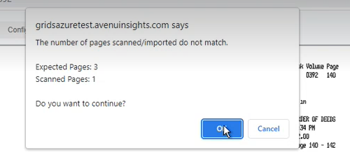 The document will appear in the window on the right of the settings. The scanning operation will count the number of pages that were scanned and compare that to the number recorded for the instrument. A message will about the page count discrepancy will appear if the two page counts do not match.