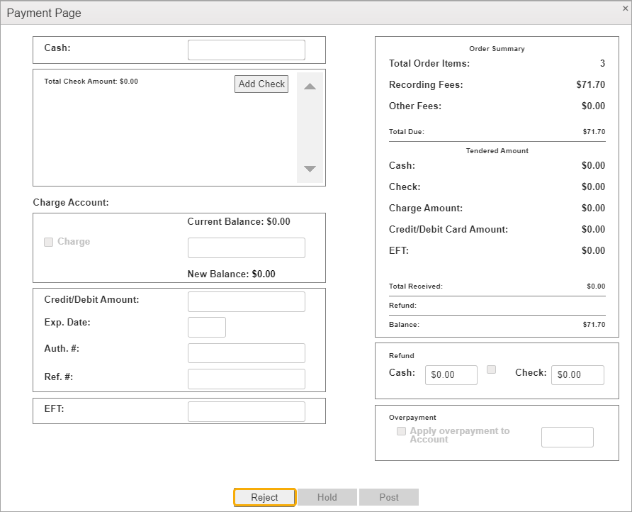 You can access the Reject button from the Cashiering grid or the Process Payment window. All the items that have been added to the order will be rejected. Then proceed with the rejection process.
