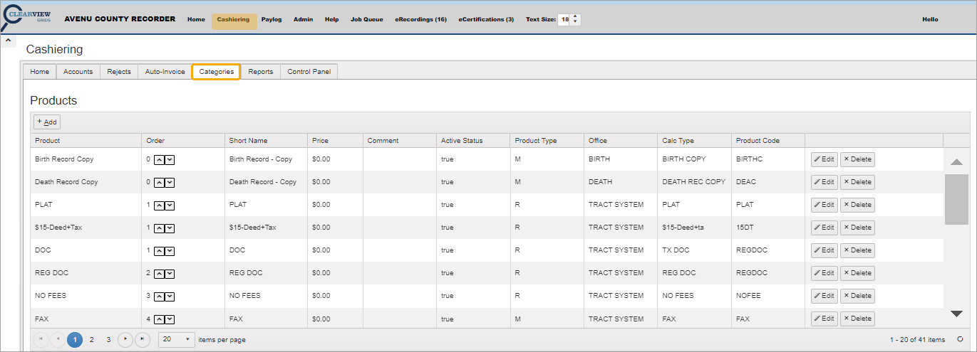 The Products screen on the Categories tab is used to add fees relevant to clients. These fees can apply to either recordable or non-recordable documents or services.