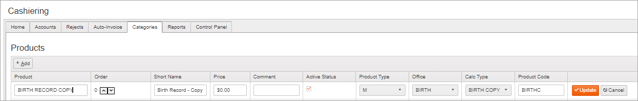 For example, we can see the Birth Certificate product fee set on the Products grid.