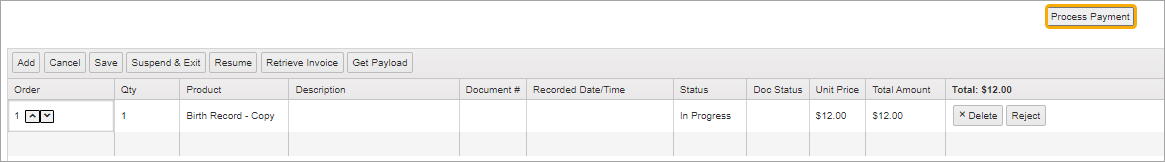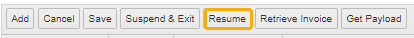 To resume work on suspended orders, click the Resume button on the Cashiering grid.