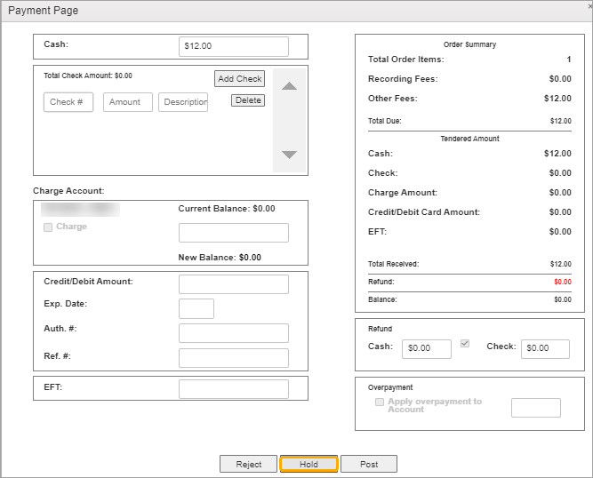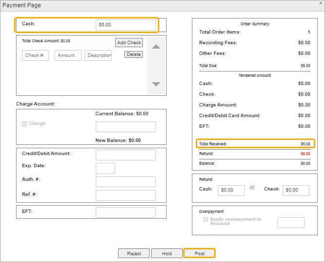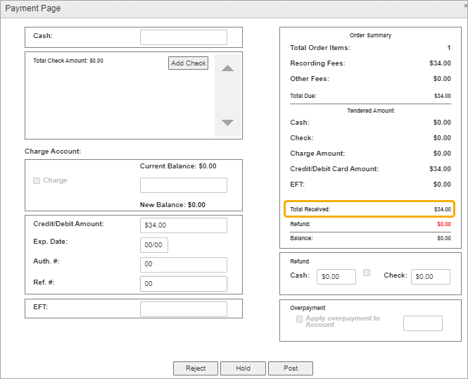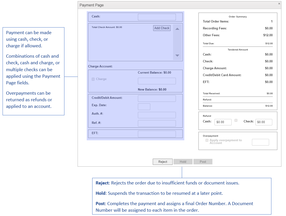 The Payment Page has sections for entering cash, check, credit, charge, or EFT funds. Payment methods can be combined to reach the full amount due.