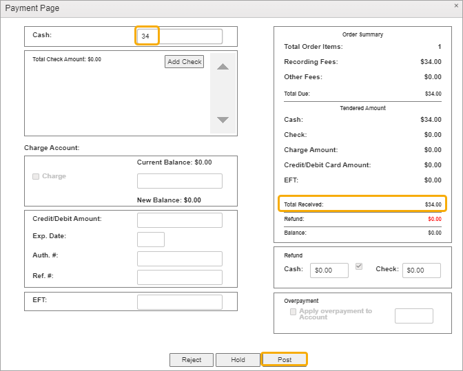 Enter the payment in the Cash field and press Enter or tab out. The amount will be reflected in the Total Received field. The Post button will be activated and you can click it to post the payment to the order.