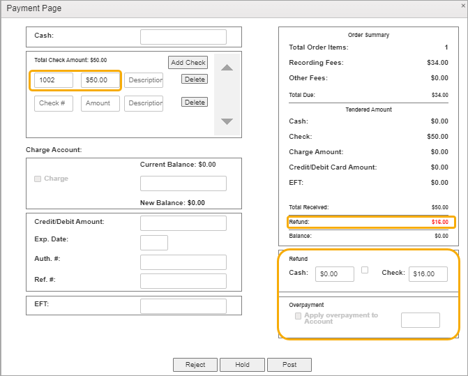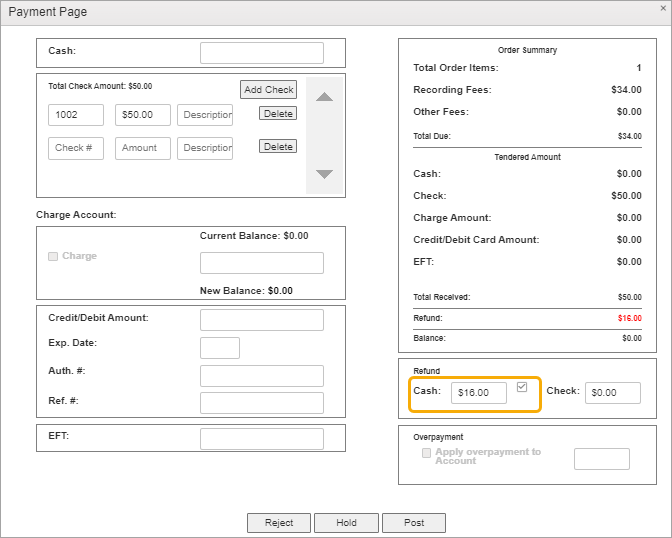 In this example, we’ve entered a $50 check on an order totaling $34. There are several options for handling the overage.